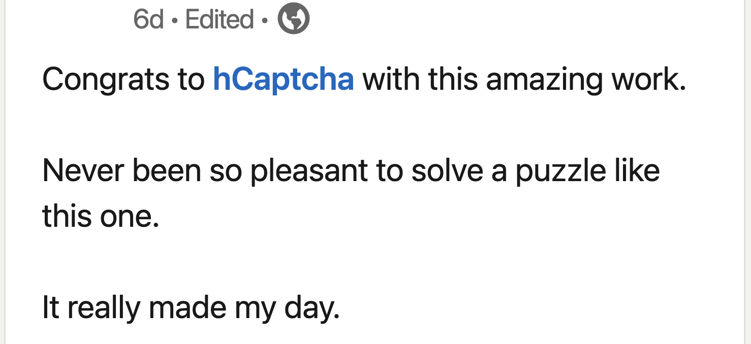 We thus adopted an explicit goal of making most people who see an hCaptcha challenge happier for having seen it, and have spent quite a bit of time working on and testing different ways to do this.